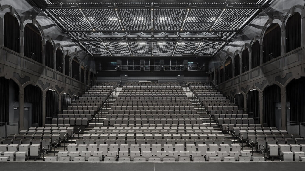 On accède à la salle de spectacle, lorsqu’elle est en configuration à l’italienne, à partir du foyer par une passerelle qui traverse le vide qui les sépare. On entre dans un grand volume opaque en béton coulé dans lequel un décor scénographique ingénieux et transformable évoque la modénature de la façade du YMCA. Devant les parois en béton latérales et leurs passerelles techniques s’élèvent des façades en bois gravées, teintes en noir, qui reprennent le module des arches sur deux niveaux de la façade de l’ancien YMCA, créant une ambiance en continuité avec l’extérieur du bâtiment. Le plancher de la scène/salle est à niveau avec celui de l’entrée principale afin de faciliter les parcours des visiteurs. Le studio de création quant à lui est installé tout en haut au-dessus de la salle de diffusion et de l’étage administratif. Il est de plain-pied avec la terrasse aménagée sur le toit de l’ancien YMCA, laquelle offre une vue magnifique sur la ville.