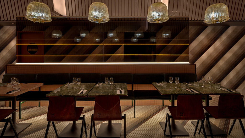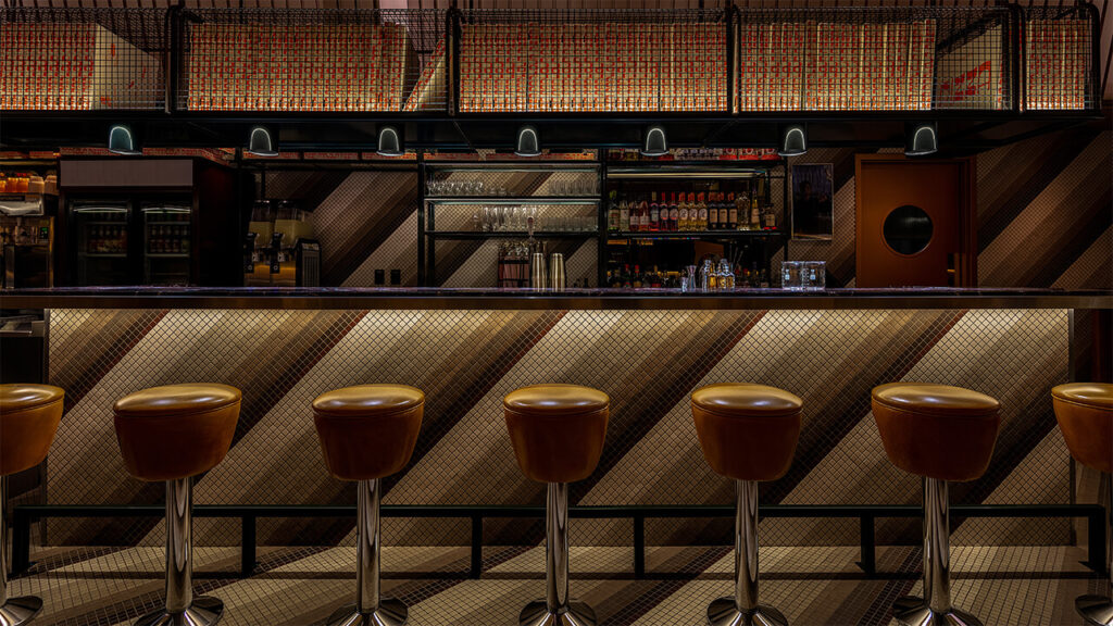 Afin d’interrompre la nature linéaire de l’espace et considérant l’étroite volumétrie existante, un motif diagonal de carrelage a été développé sur mesure assurant la continuité des surfaces au plancher, murs et bar.