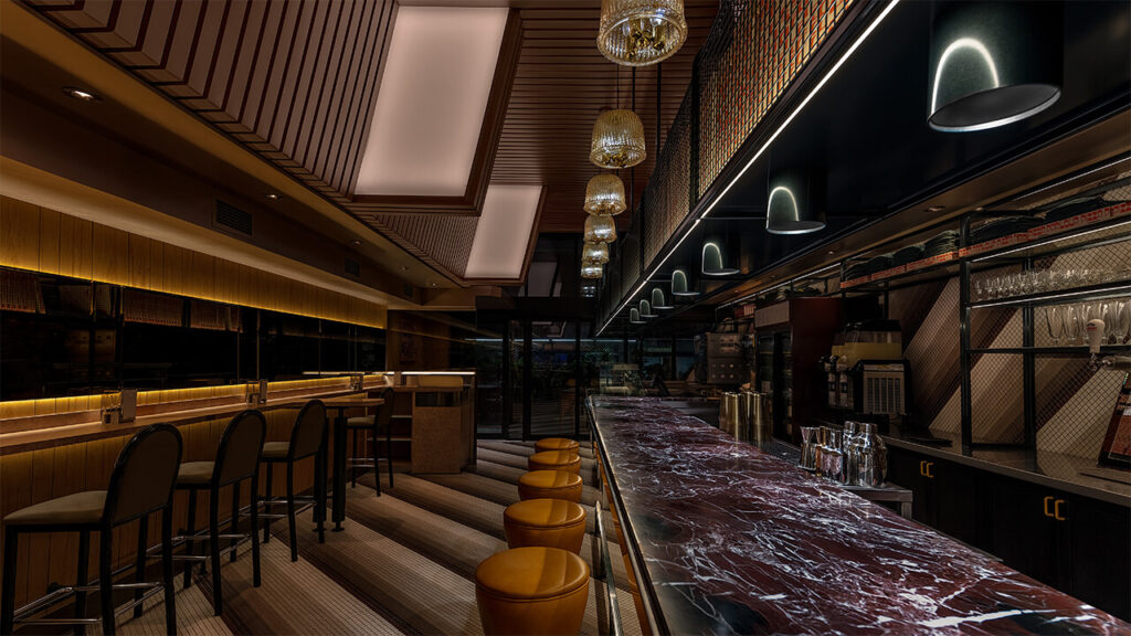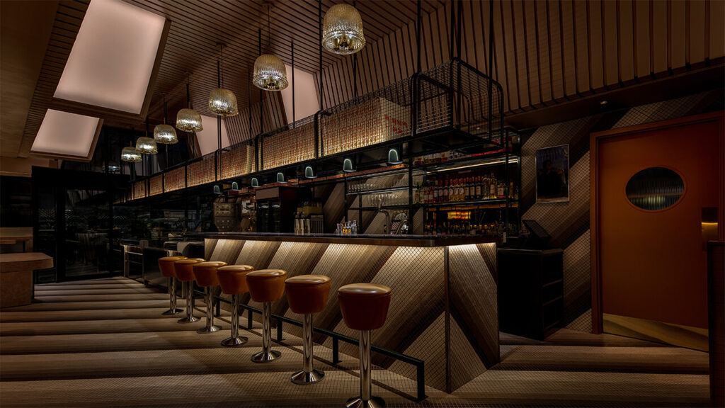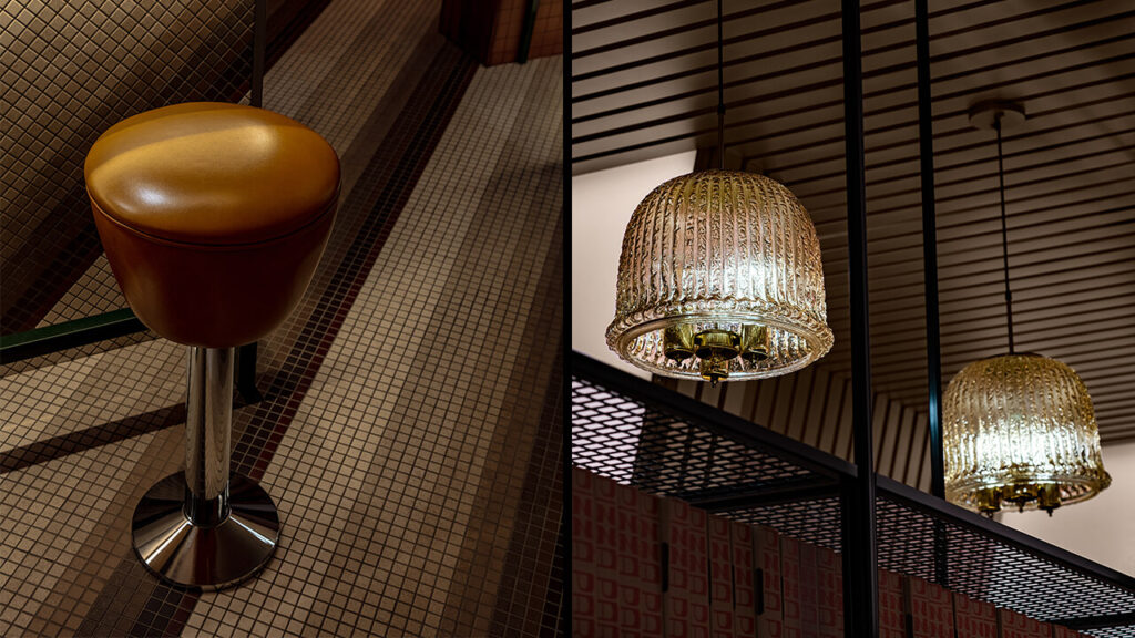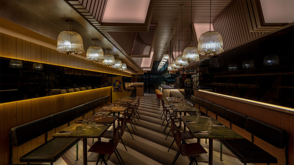 L’espace d’origine, un ancien corridor marchand, possédait un caractère unique dont l’Atelier s’est inspiré pour alimenter le concept. Avec son plafond en lattes métalliques rythmées à l’image d’une architecture des années 80, l’équipe a reconnu un artéfact vintage d’intérêt à conserver. Le plafond existant a fait l’objet d’une restauration intégrale incluant également les anciens dispositifs à enseignes repensés pour diffuser une lumière d’ambiance tamisée.