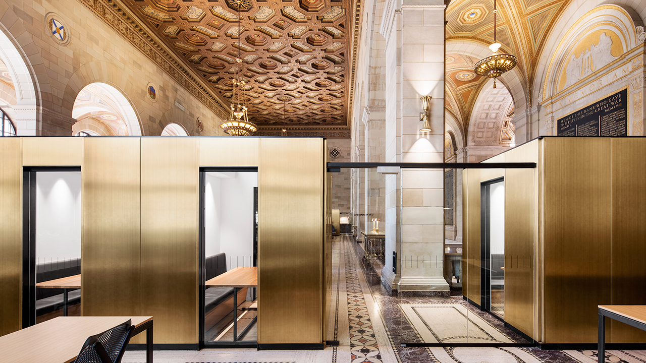 Ce sont d’ailleurs ces éléments existants patrimoniaux qui ont présenté une véritable opportunité architecturale. Cette remarquable coquille contenant des vestiges de toutes sortes, démontrant le talent des artisans de l’époque est maintenant recyclée. Le bâtiment de 1926, muni d’un plancher de marbre, d’un plafond décoratif en plâtre peint, de plusieurs éléments en laiton coulé, présente un fond indéniable. Faisant face à cette riche présence de détails, le nouveau projet doit établir une relation entre l’ancien et le contemporain. Il s’agit d’intervenir avec discrétion, de ressusciter ce lieu avec un nouvel usage, une nouvelle vie, qui prend forme par des gestes simples et dépouillés. Les nouveaux murs sont recouverts d’acier plaqué avec du laiton, de façon à établir une relation avec les éléments en laiton d’origine. Les cloisons qui divisent les salles de conférence, font par hasard un clin d’œil aux anciens présentoirs de la banque où se situaient, à l’époque du papier, des casiers pour les feuilles de dépôts. Maintenant, ces meubles ressemblent à une maquette pour la nouvelle intervention.