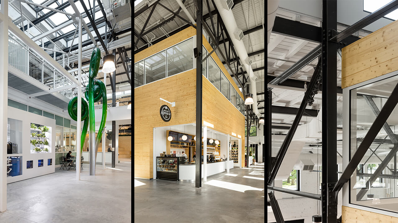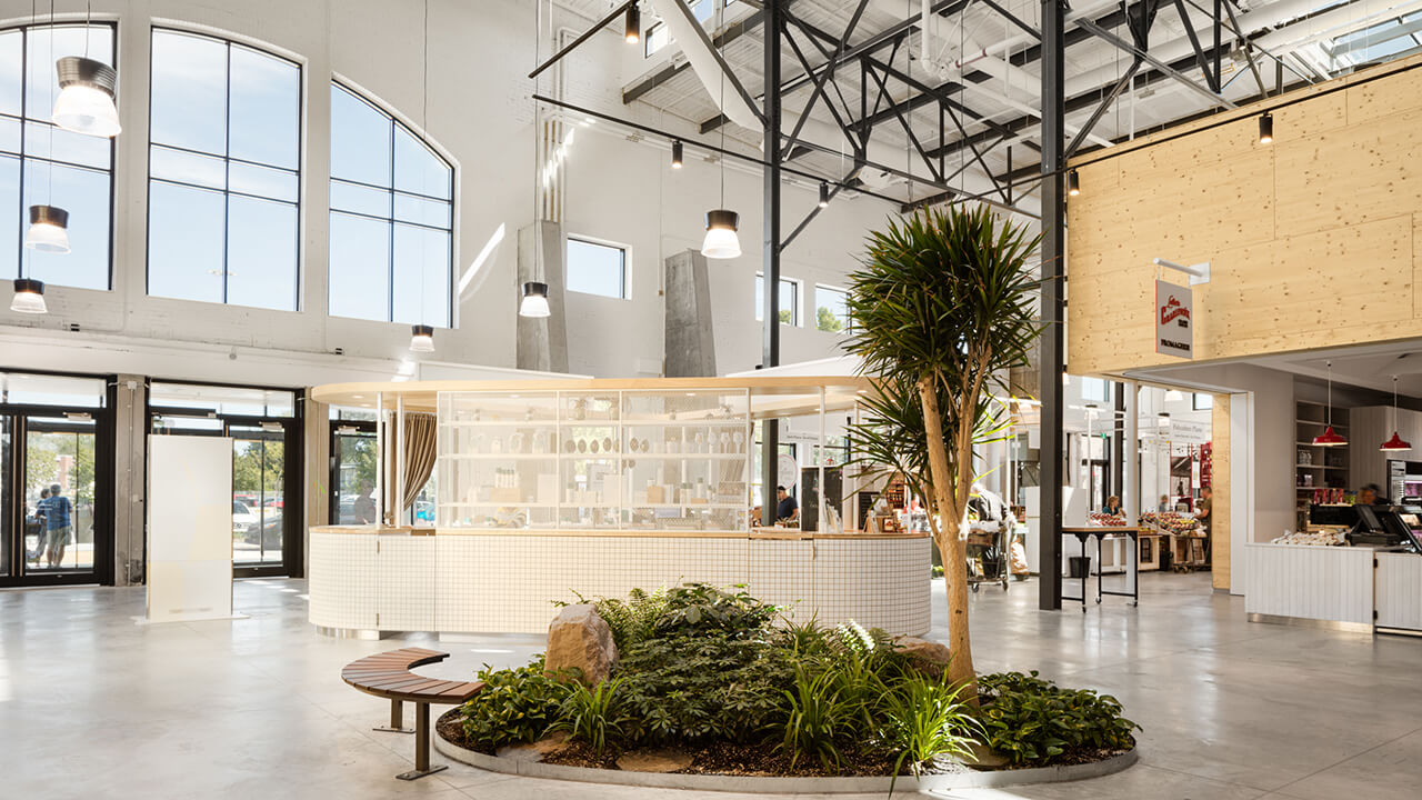 Les éléments architecturaux existants, tels que les colonnes et frontons existants ont été traités avec une grande sensibilité ce qui a permis de les conserver pour assurer la pérennité des constructions datant de 1923. L’équipe de Bisson associés+Atelier Pierre Thibault a ainsi contribué à la mise en valeur d’un bâtiment presque centenaire qui fera rayonner les produits des artisans et marchands de la région de Québec et des environs à travers un milieu riche où tous les sens seront stimulés.