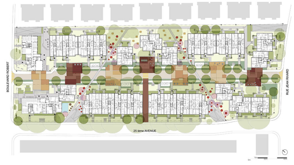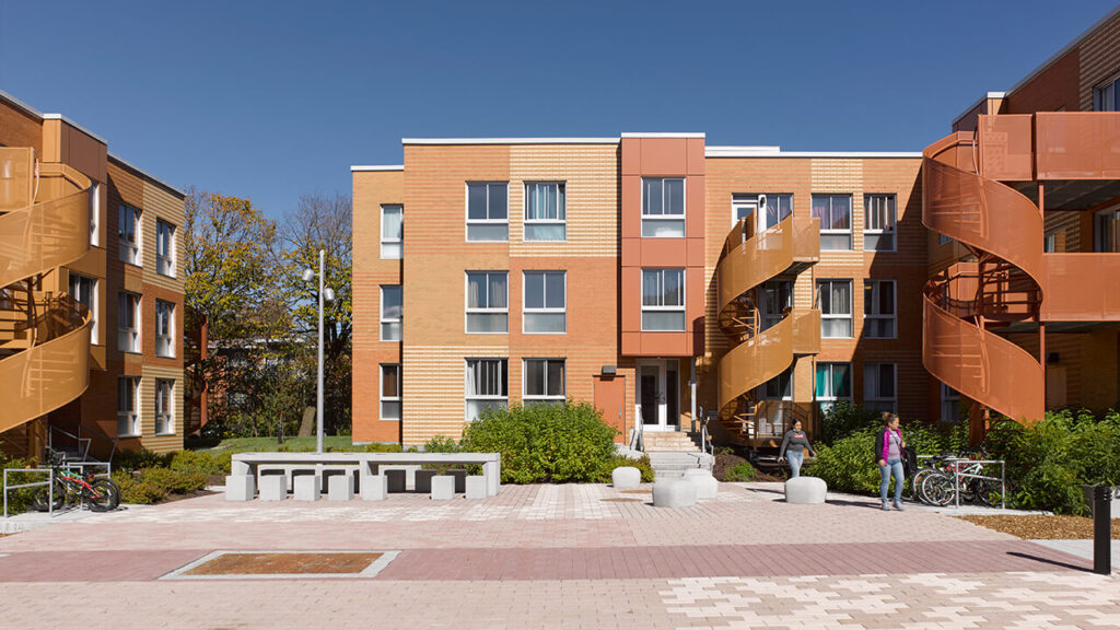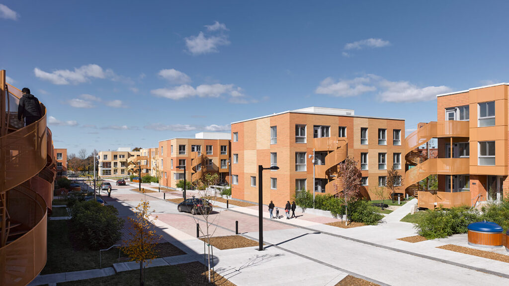 Le projet a également été conçu dans un objectif d’efficacité énergétique optimale, tant au niveau de l’enveloppe que des systèmes mécaniques. La rue partagée offre des surfaces de circulation piétonnes et véhiculaires au pavage perméable et le plan d’aménagement paysager prévoit des bassins de rétention et de bio-rétention des eaux pluviales. Enfin, le site est doté d’un système de gestion des déchets et des matières recyclables novateur, utilisant de grands bacs communs semi-enfouis. De nombreux arbres ont également été conservés sur le site.
