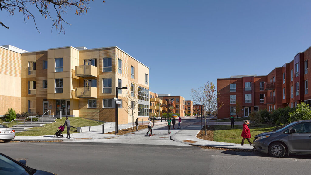 Voilà non pas des condos de luxe, mais bien un projet de logements sociaux datant des années 1970, qui a été brillamment renouvelé pour bonifier la qualité de vie des résidents. Création d’une allée familiale de type « Woonerf », embellissement du site, locaux communautaires bonifiés, assainissement des bâtiments (moisissures)… Les bons coups sont nombreux. Si vous désirez comprendre l’ampleur du défi relevé par l’équipe d’architectes, nous vous invitons à faire une visite Google Street View du site en 2016.