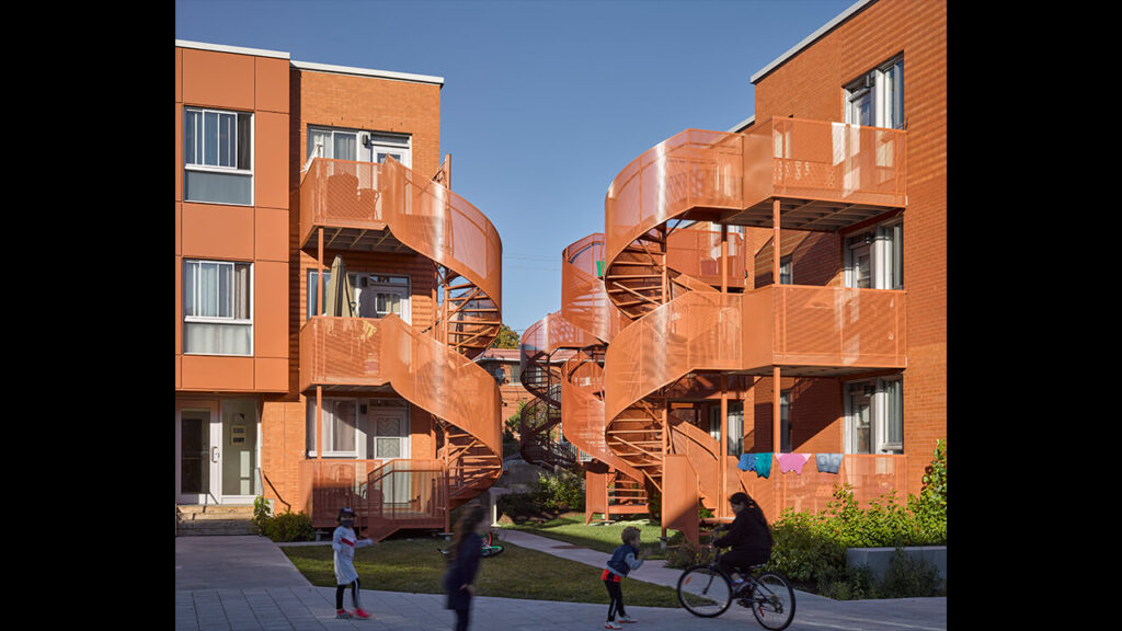 Les Habitations Saint-Michel Nord, ensemble de 185 unités à prix modique situé dans le quartier Saint-Michel à Montréal, ont fait l’objet d’une revitalisation majeure au cours des trois dernières années par Saia Barbarese Topouzanov architectes. Conçu au début des années 70, par l’architecte montréalais Philip Bobrow, où le style brutaliste était à l’honneur, le complexe jouit aujourd’hui de lumière et couleurs, et s’affirme joyeusement dans le paysage, réclamant respect et dignité pour ses résidents.