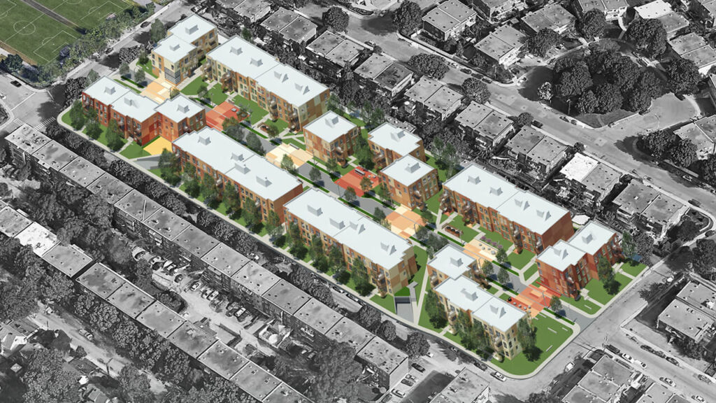 Conformément aux objectifs du scénario adopté, la tâche première des architectes a été d’élaborer une stratégie qui permette de désenclaver l’îlot, de conserver le même nombre d’unités disponibles, de remédier aux problèmes d’enveloppe et de sécurité et, enfin, de créer un cadre de vie plus ouvert à la communauté.