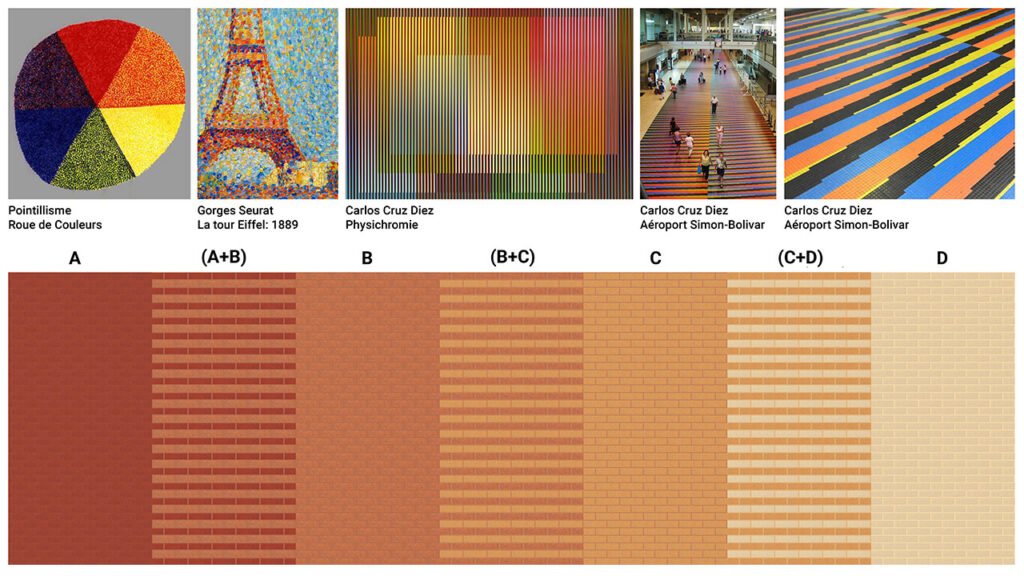 Les architectes ont puisé leur inspiration dans les œuvres d’un grand artiste vénézuélien, Carlos Cruz-Diez (1923-2019). Son travail, visible encore aujourd’hui dans de nombreux lieux publics d’Europe et d’Amérique du sud, joue sur les effets cinétiques obtenus par rapprochement et superposition.