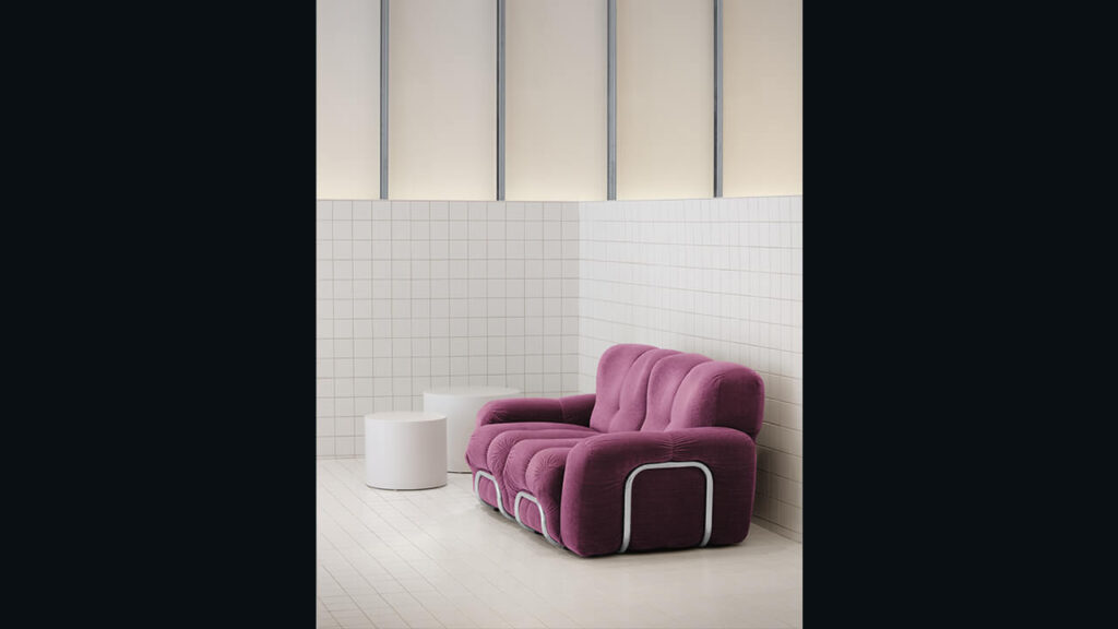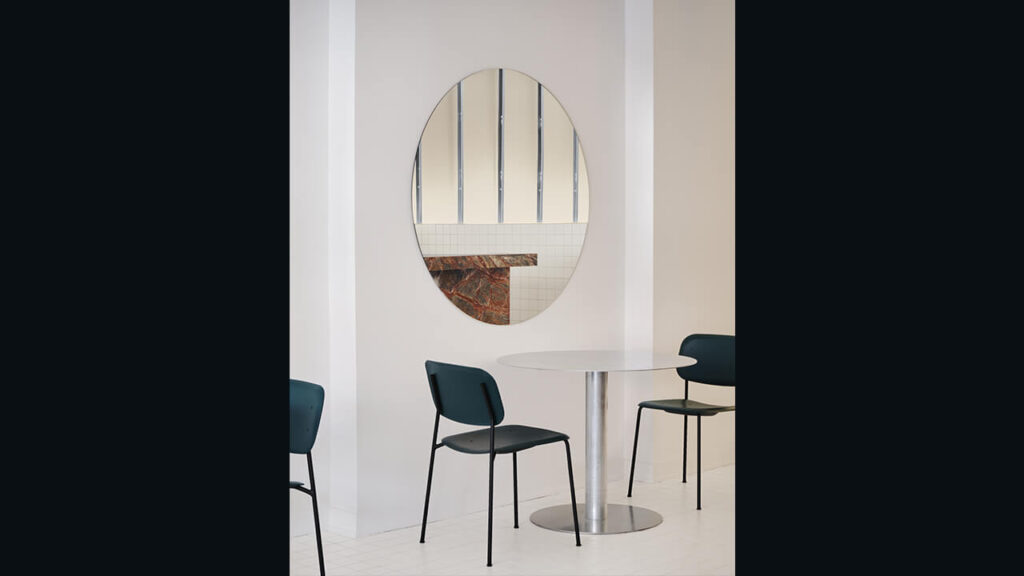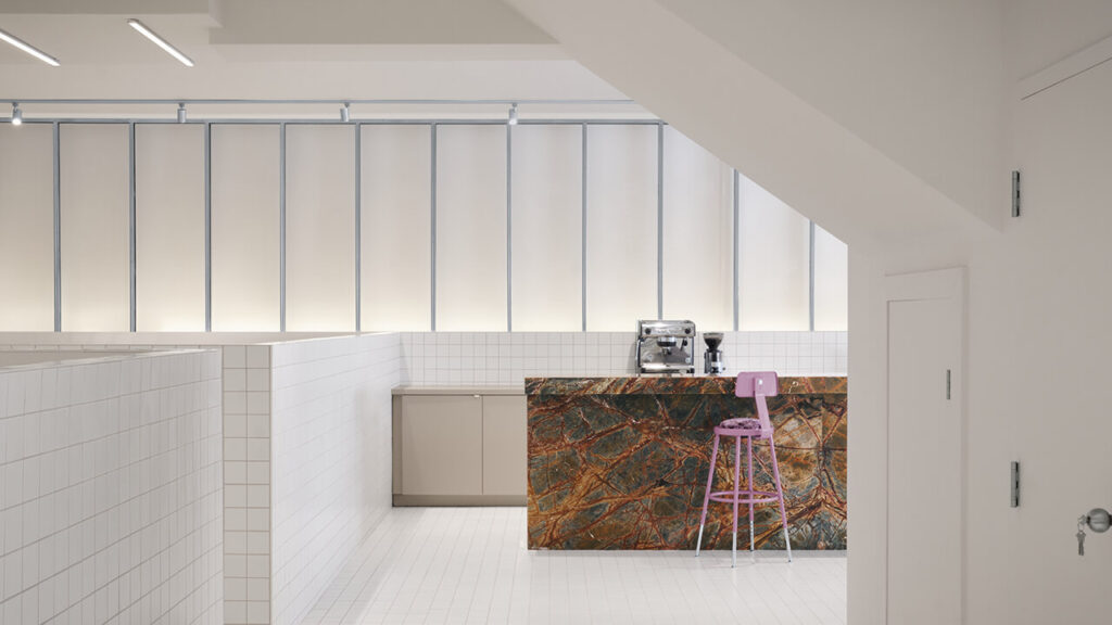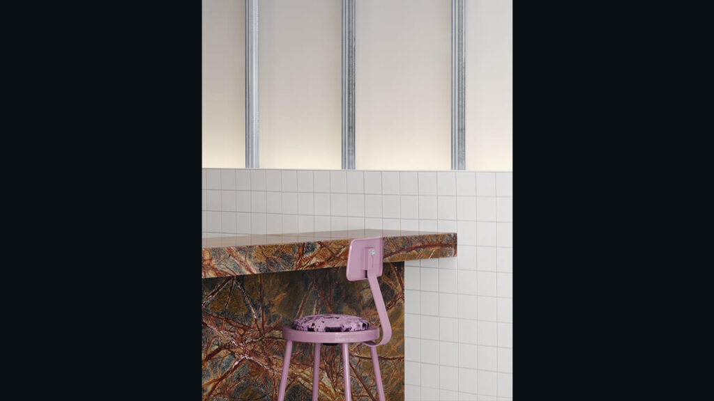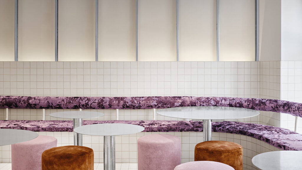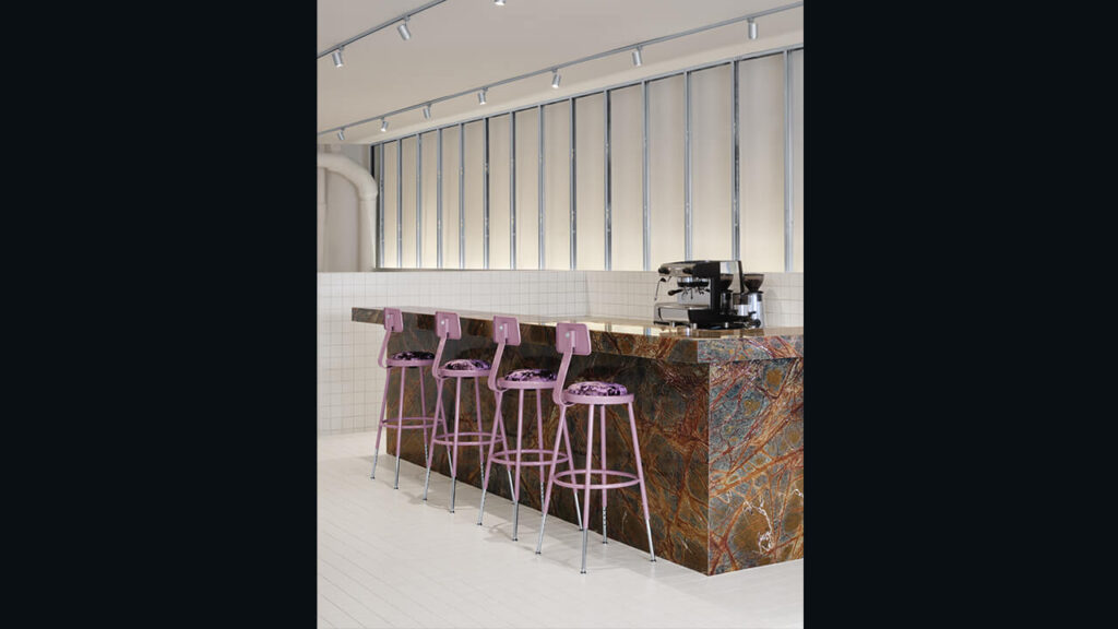 À l’exception des tables rondes faites d’acier galvanisé, tout le mobilier du projet contraste avec le canevas sans prétention des matériaux de construction apparents. Lorsqu’on entre dans l’espace, toute notre attention est dirigée vers le bar. Le monolithe recouvert de marbre mesure prêt de 20 pieds de long et détonne de l’environnement blanc et épuré avec ses veines impressionnantes et ses couleurs volcaniques. La longue banquette courbée est recouverte d’un velours mauve métallique et est accompagnée de poufs orange et roses dispersés un peu partout dans le café. Pour terminer, même les tabourets d’atelier et les chaises de marque Hay sont respectivement de couleur lilas et vert forêt.
