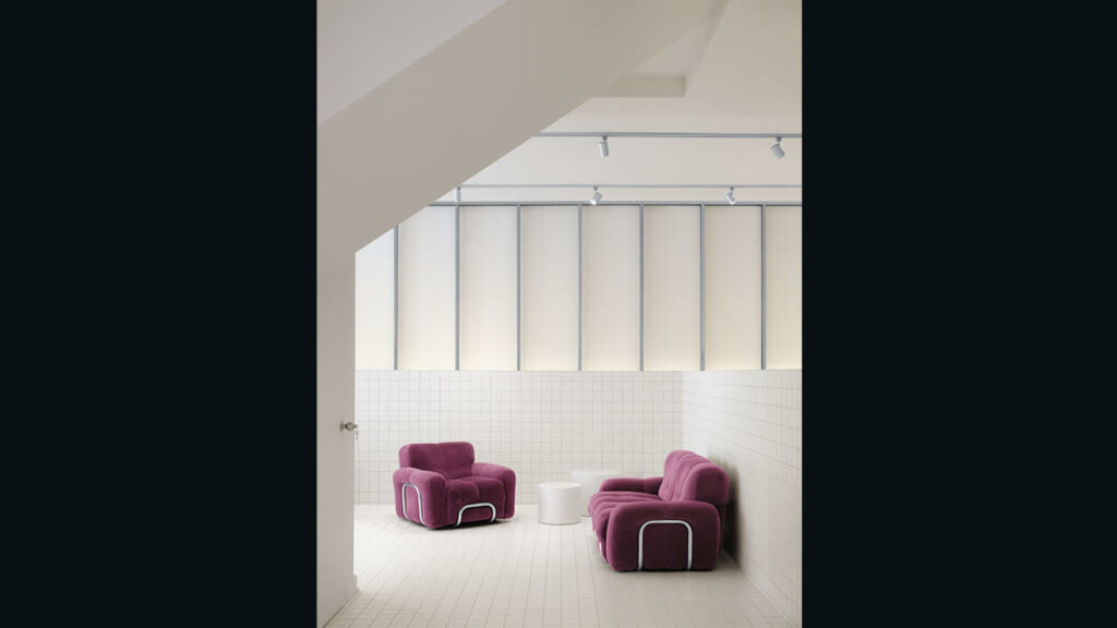 Le design se matérialise sous la forme d’une palette de matériaux sobres, qui présente un canevas neutre mettant en valeur le travail exposé. Le long comptoir-bar et les éléments de mobilier en velours ajoutent ponctuellement une touche de magie dans l’espace, évitant le côté stérile qu’on attribue parfois à des décors blanchâtres et contemporains.