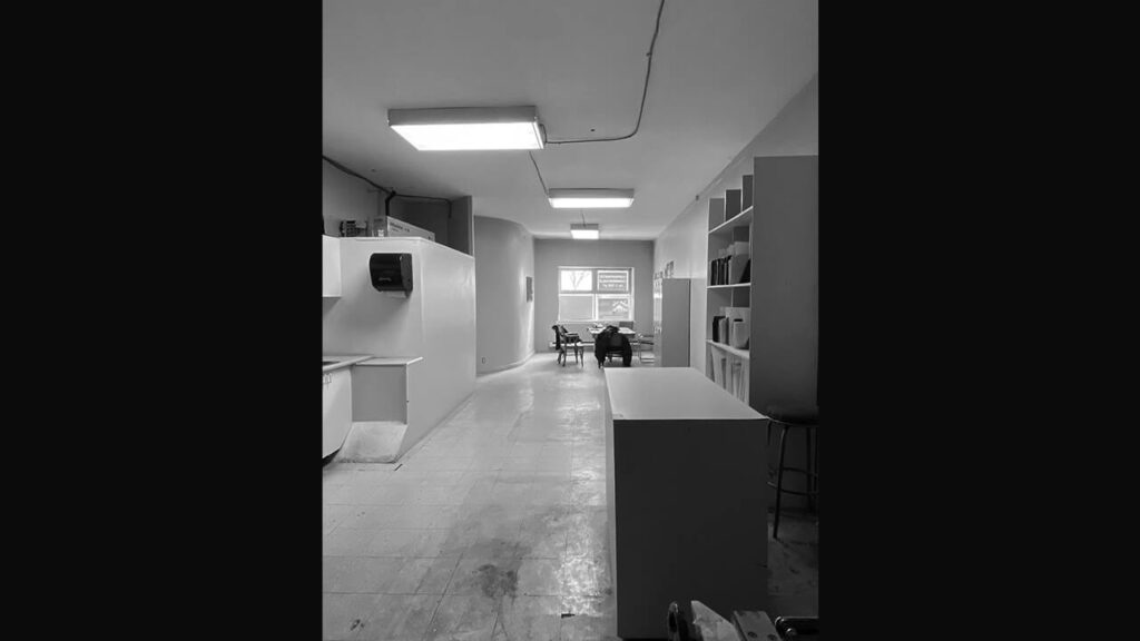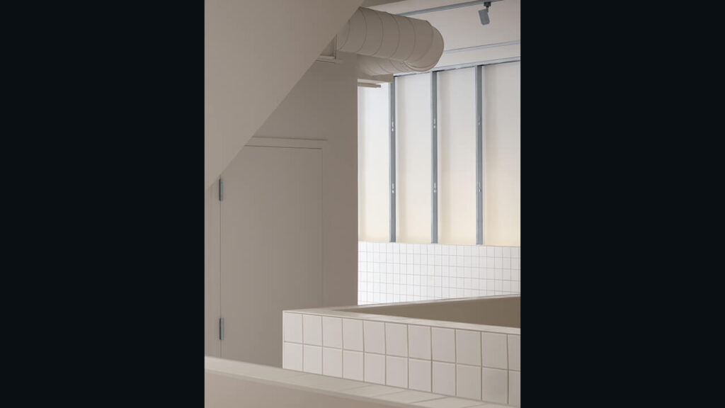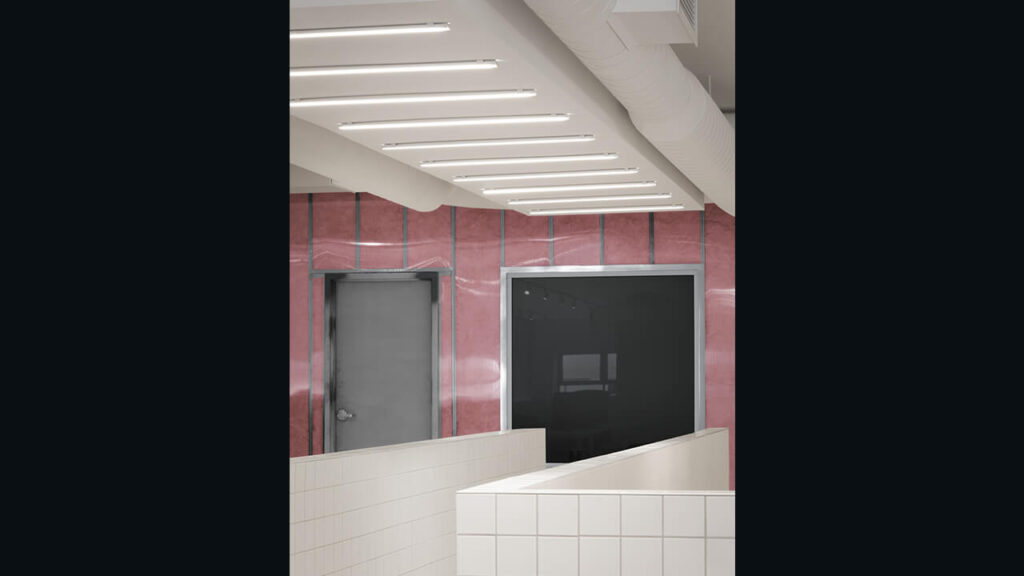 Les murs existants, la plomberie ainsi que les équipements de ventilation ont tous été peinturés blancs. La portion basse du local a quant à elle été recouverte de tuiles de céramique blanche sur 4 pieds de hauteur. Les murs en périphérie exposent des montants métalliques qui vont du plancher jusqu’au plafond. Derrière, un système d’éclairage rétroéclaire ces structures qui sont utilisées comme espace d’affichage pour de l’art, des posters ou n’importe quel élément graphique relié aux évènements de M.A.D. En ce qui concerne l’éclairage général, une série de longs rails avec projecteurs sont installés au plafond et vont de l’avant du local jusqu’à l’arrière. Ce système flexible permet d’ajuster l’éclairage en fonction de l’évènement qui s’y déroule, comme dans une galerie d’art. La rampe qui mène vers l’arrière est une expérience en soi. L’espace étroit revêtu de céramique est placé sous une série de tubes lumineux, donnant l’impression d’être sur la piste d’un défilé de mode. Quant à elles, les pièces fermées à l’arrière sont recouvertes de feuilles de polycarbonate au lieu des panneaux de gypse conventionnel, exposant ainsi la laine de roche isolante à l’intérieur des murs. Tous les cadres de métal ainsi que les portes en acier ont été laissés brut et à l’état naturel afin de mettre en valeur leurs imperfections.
