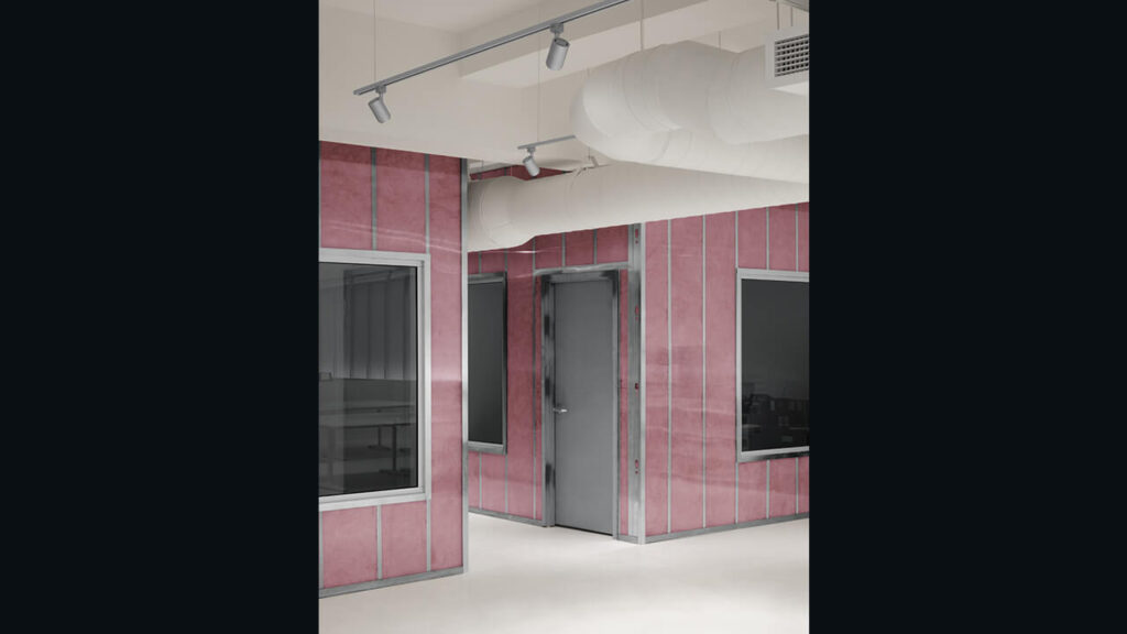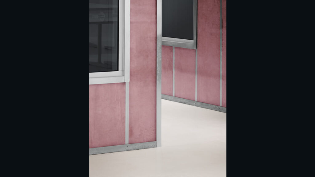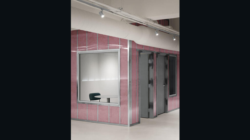 Élément marquant du projet qu’on ne peut passer sous silence : la laine minérale rose et les colombages métalliques qui sont exposés derrière des feuilles de polycarbonate. Surprenant à première vue, tout en étant habillement intégré visuellement afin de répondre à des fonctions acoustiques pour les salles de réunion.