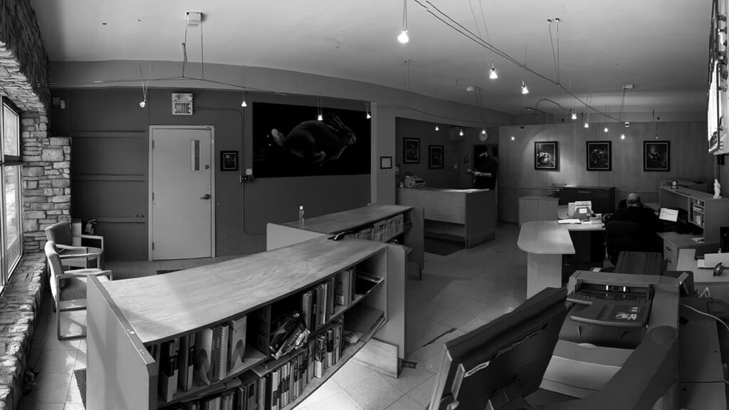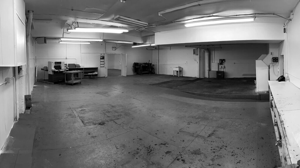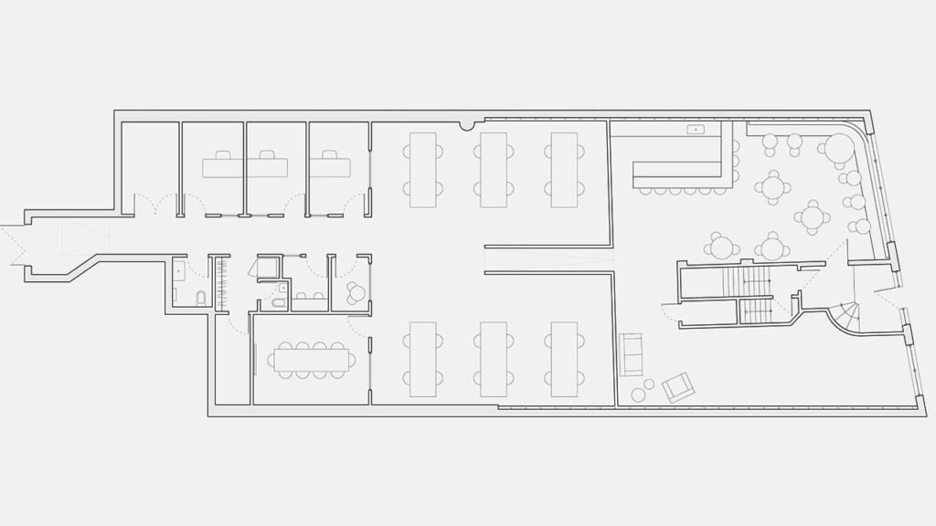 Le bâtiment représentait plusieurs défis importants. Abritant une imprimerie depuis sa construction en 1939, l’espace était très profond et n’avait de fenêtres que sur sa façade principale. C’est pour cette raison que les fonctions publiques du programme ont été disposées à l’avant et les fonctions privées à l’arrière. L’entrée dans les bureaux se fait directement par l’espace café. À cet endroit, un grand bar sert de cuisine pour les employés durant le jour et de comptoir de service lors d’évènements spéciaux en soirée. Une longue banquette épouse les murs et sert d’espace pour manger, travailler et pour des rencontres informelles. De l’autre côté du bloc central (contenant la circulation commune du bâtiment) se trouve la deuxième section naturellement éclairée du local. Celle-ci est aménagée comme un espace flexible en aire ouverte comportant un salon et est utilisé comme studio photo, vidéo ou tout autre type création de contenu. La moitié arrière du local, ayant été initialement renforcée avec du béton, est 2 pieds plus haut que le reste de l’espace. Cette différence de hauteur a été utilisée pour séparer les fonctions publiques à l’avant de l’espace de travail plus formel à l’arrière. Une rampe de 16 pieds de long sert de passage entre les deux zones. De part et d’autre de cette rampe se trouvent des bureaux à aire ouverte. Au fond du local, où la lumière se fait plus rare, se trouvent les bureaux fermés, les salles d’appel et les salles de conférence.