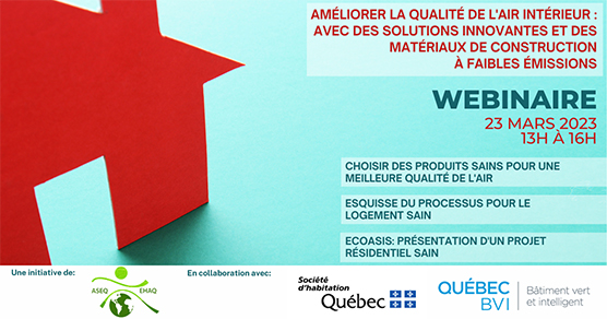 « L’Association pour la santé environnementale du Québec (ASEQ-EHAQ), en collaboration avec la Société d’habitation du Québec et Québec BVI (Bâtiment vert et intelligent), organise un webinaire intitulé «Améliorer la qualité de l’air intérieur : avec des solutions innovantes et des matériaux de construction à faible émission». Cet événement permettra de sensibiliser les industries, les décideurs et la communauté du bâtiment à l’importance de développer et de commercialiser des matériaux et produits de construction à faible émission avec un étiquetage transparent et clair et de rechercher des solutions innovantes pour une bonne qualité de l’air intérieur.